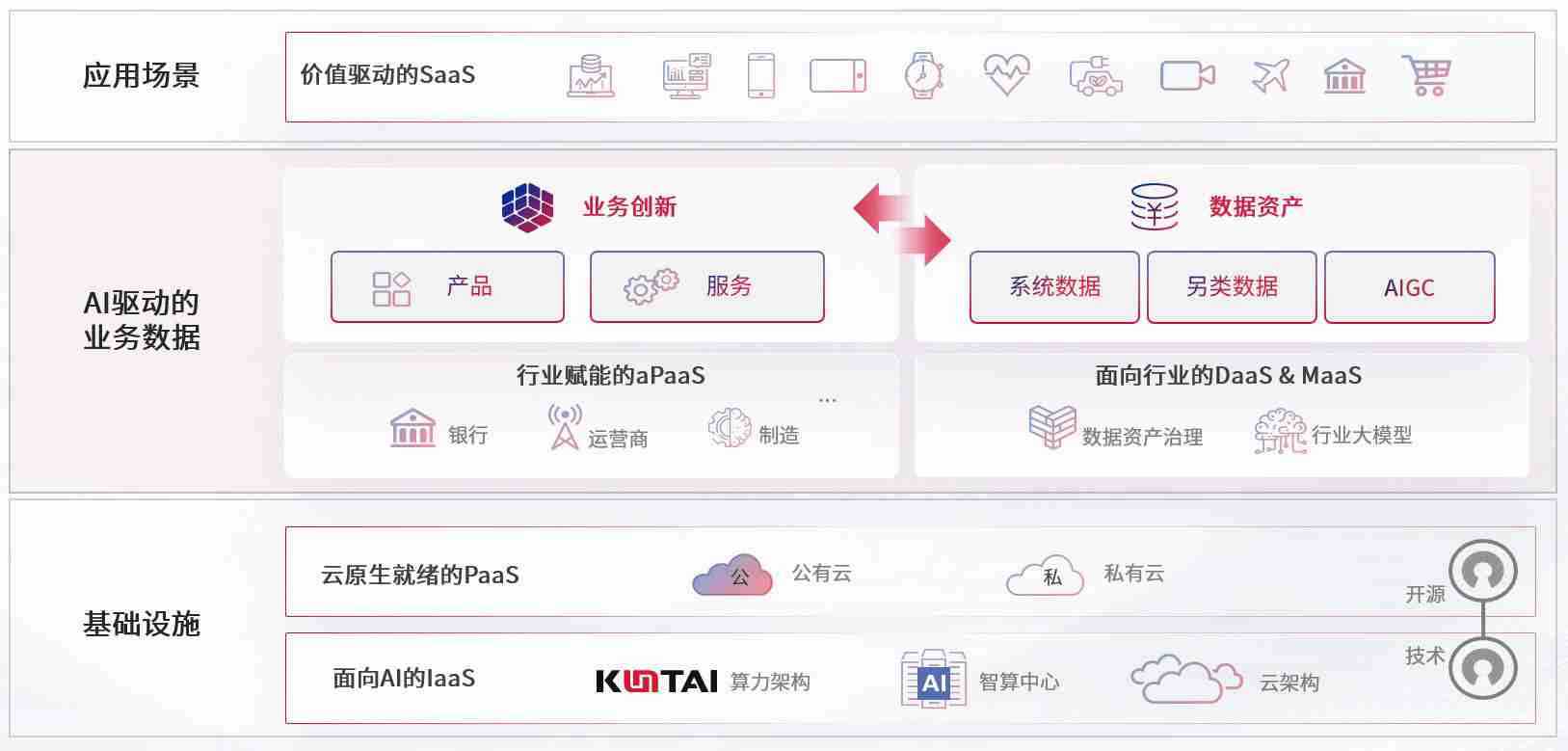 数字时代,,围绕企业数字化转型的关键要素,,z6com尊龙凯时数码开创性的提出数云融合战略和技术体系框架,,,着力在云原生、、数字原生、、、、AI原生和信创产业上架构产品和服务能力,,,,为处在不同数字化转型阶段的快消零售、、、、汽车、、、金融、、、、医疗、、政企、、、教育、、、、运营商等行业客户提供泛在的敏捷IT能力和融合的数据驱动能力,,,,构建跨界融合创新的数字业务场景和新业务模式,,,,助力企业级客户建立面向未来的核心能力和竞争优势,,,全面推动社会的数字化、、、智能化转型升级。。