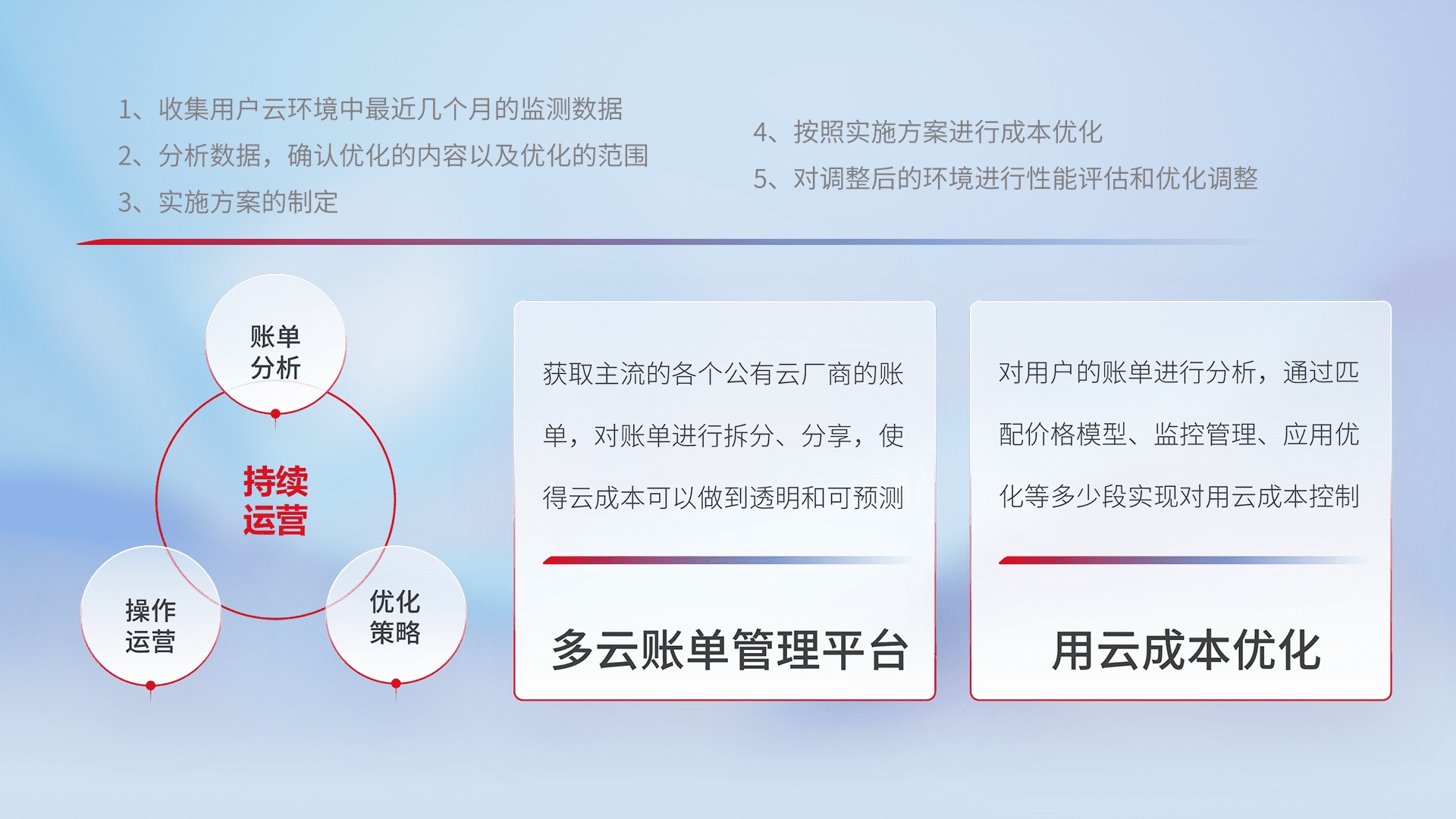通过多云纳管,,,以统一的资源数据模型把客户的云资源进行抽象和封装,,,进而实现对多云资源的统一操作,,,保障云资源管理的可靠性、、、稳定性与可用性。。量身定制化运维内容,,,配置、、、开发运维、、、、补丁管理、、备份、、监控、、、认证和访问管理、、、、审计和日常巡检等,,,保障在用云过程中的可靠度,,,稳定度以及高可用率。。。